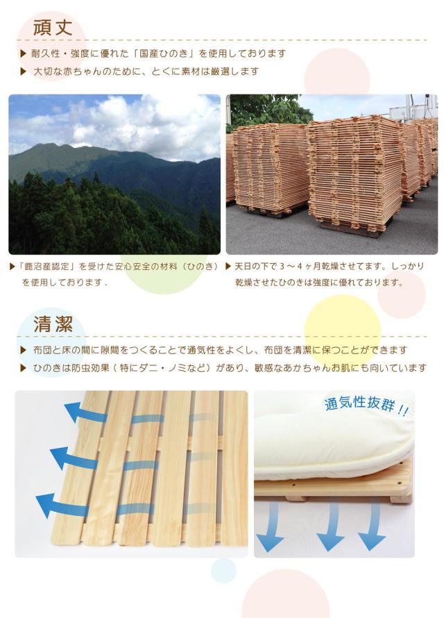 ・あかちゃんの健康を考え、接着剤・塗料・防腐剤・防カビ剤など有害と思われる素材を使用しない、安心ひのき材だけで作るベビーベッドです。
