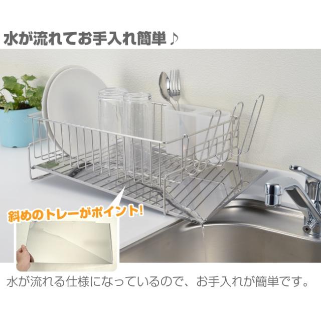 斜めに流れる1段水切り。右置き用と左置き用が選べます。水切りトレーがポイント。水が流れる仕様になっているので、お手入れ簡単です。奥まで使えるからキッチンスペース広々。