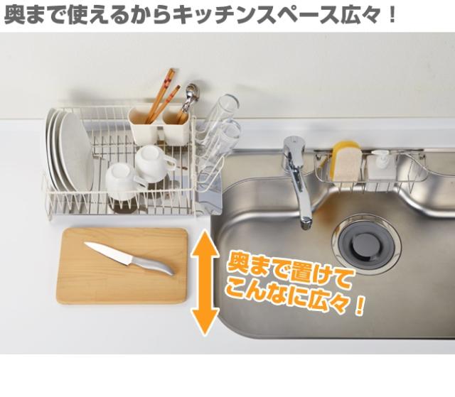 キッチン周りの整頓ができる水切りラック。狭いスペースでも効率よくまとめられるので、手前をあけて作業スペースにできます。