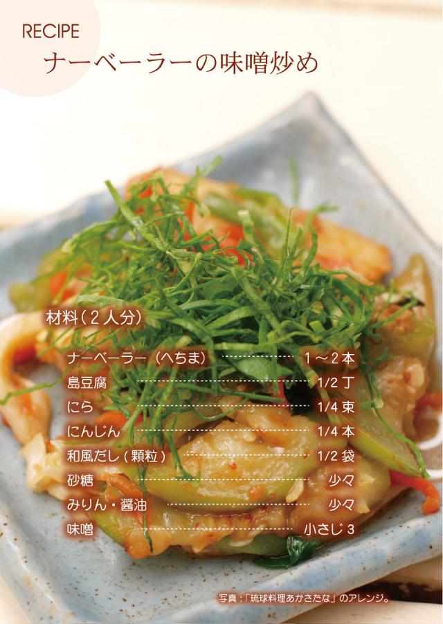沖縄ではナーベーラーを味噌煮にすることが多く、そのなめらかな食感とまろやかな甘味が食欲をそそります。その他、炒め物や汁物にも適しています。皮をそいで、柔らかいタネもそのまま残して調理します。