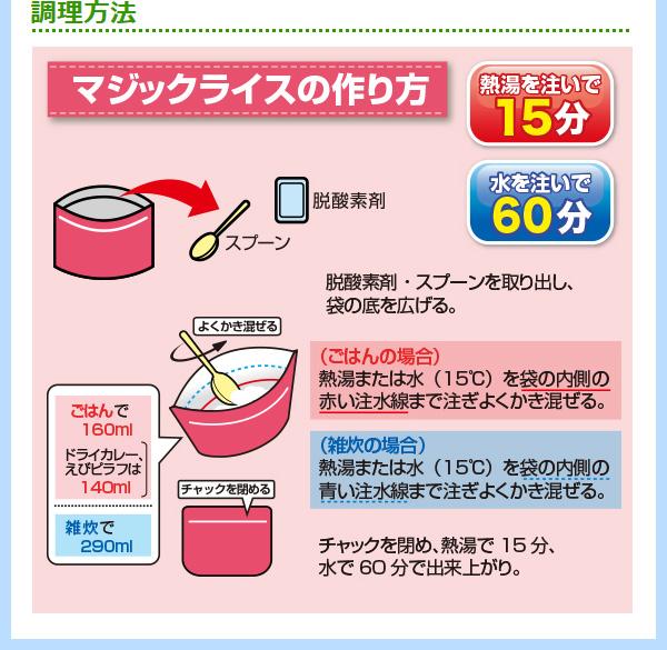 お湯や水を適量加えるだけで、炊きたての状態に戻ります。