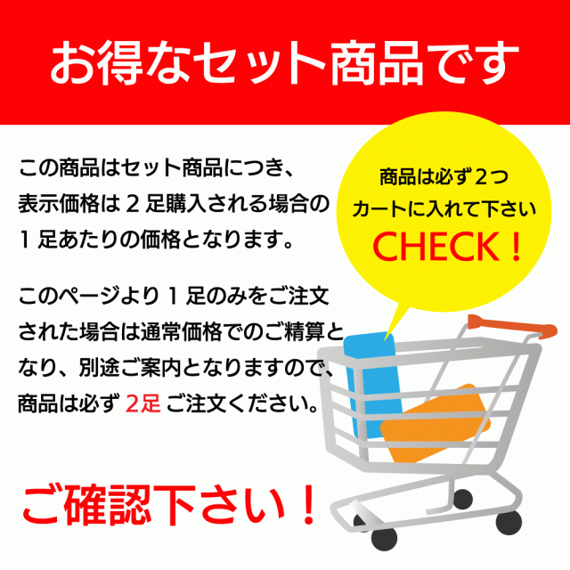 ご希望の商品を2つ選び、カートに入れて購入手続きを行うだけでセット購入となりますので、1足あたりの価格を表示価格にてご精算させていただきます。
