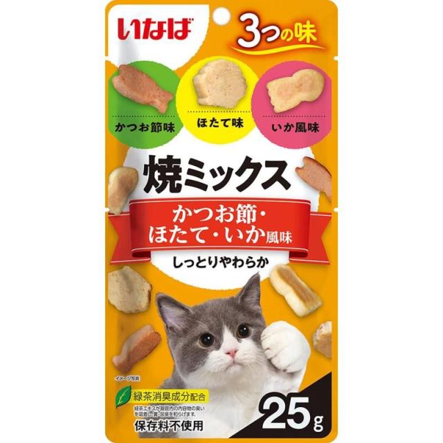(まとめ買い)いなばペットフード いなば 焼ミックス3つの味 かつお節・ほたて・いか風味 25g QSC-121 猫用おやつ 〔×24〕 【北海道・沖縄・離島配送不可】