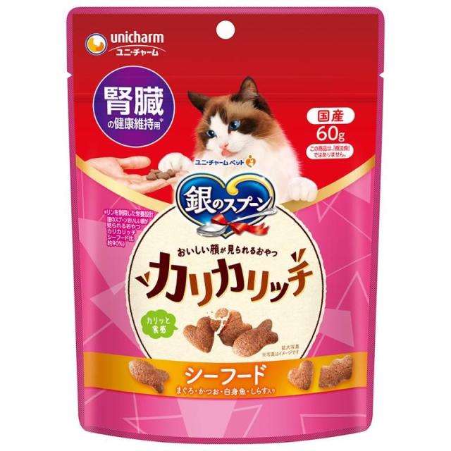 (まとめ買い)ユニ・チャーム 銀のスプーン おいしい顔が見られるおやつ カリカリッチ 腎臓の健康維持用 シーフード 60g 猫用おやつ 〔×15〕 【北海道・沖縄・離島配送不可】