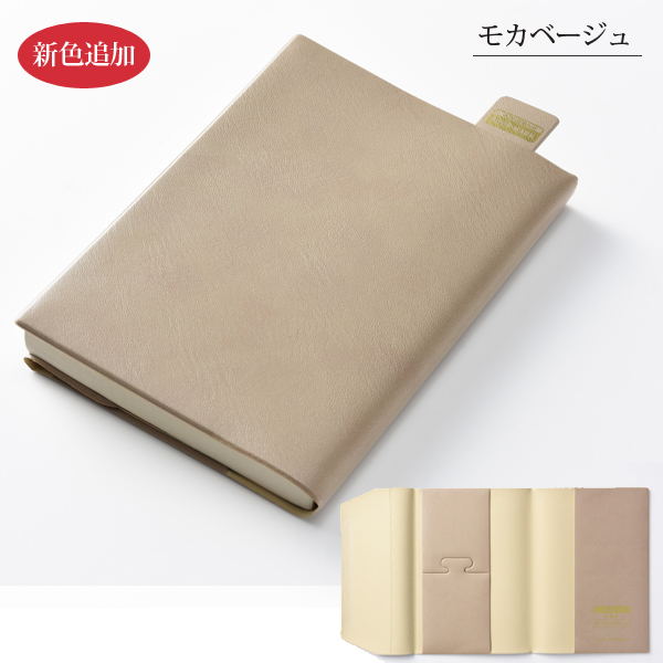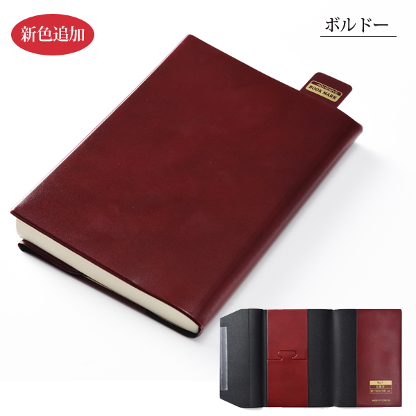 扱いやすい合皮タイプのブックカバー。本革に比べて軽量で水や汚れに強く、日常使いにぴったりです。カバンの中に入れても痛みにくく、本の厚みに合わせて調整可能。新書サイズの本をしっかり保護します。