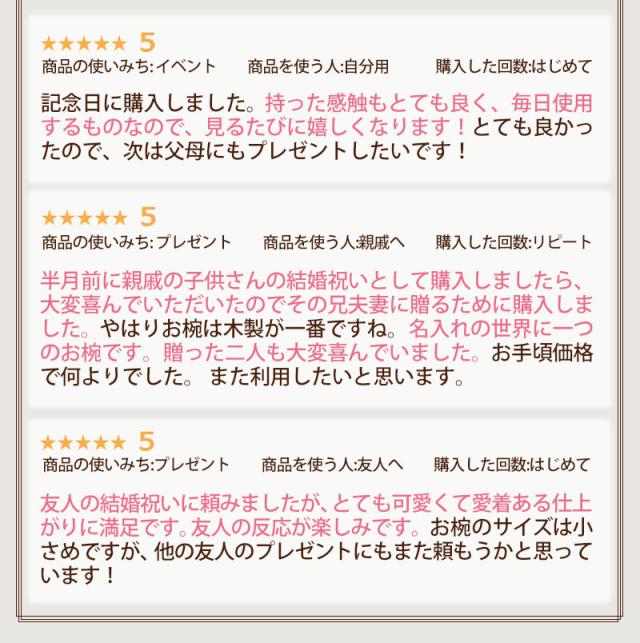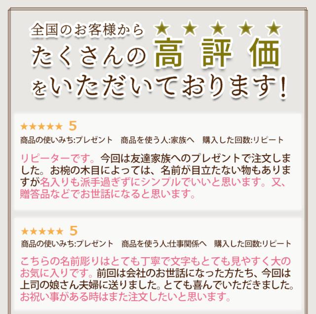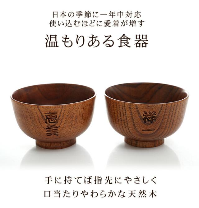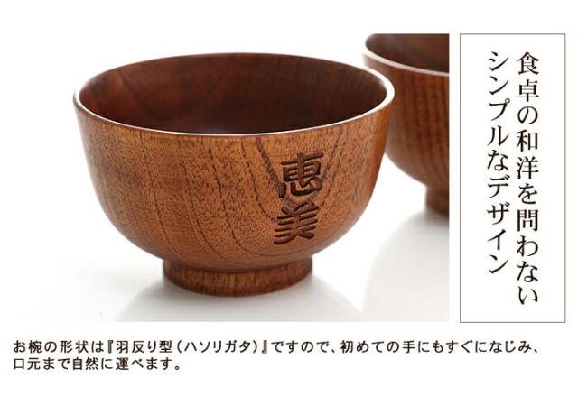 汁椀にそれぞれお名前を彫刻いたします。 あなただけのオリジナルギフトになります。もちろんご自宅用に、オリジナルマイ椀としてもどうぞ。 名入れの文字数は3文字程度までが最適です。それ以上になりますと、スペースの関係で文字サイズが小さくなってしまいます。予めご了承ください。 彫っていますので、よほどの事が無い限りお名前は消えません。 また、お名前自体が強調せず自然な感じで入っているのも魅力のひとつです。 お椀の素材にもこだわっています。贅沢に天然の木をくりぬき、数回に渡り漆を塗って仕上げています。 お椀の形状は『羽反り型(ハソリガタ)』ですので、初めての手にもすぐになじみ、口元まで自然に運べます。 木製のお椀は熱伝導率が低いので冷めにくく、最後まで温かいまま召し上がる事ができます。 独特の木の感触も楽しめ、普段の食事も上質なものになりますね。 いつものお味噌汁がぐーんっと美味しくなりますよ。 専用のギフトボックス入りです。どんな人やシーンにも贈りやすいギフトセットです。 敬老の日、母の日、父の日、お誕生日プレゼントに大人気です! |
