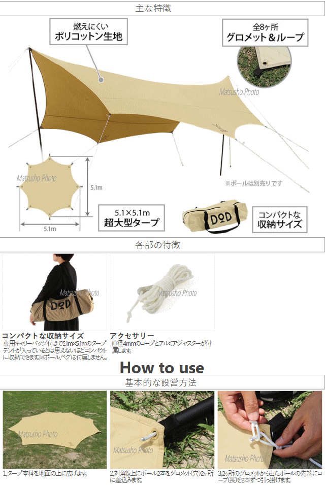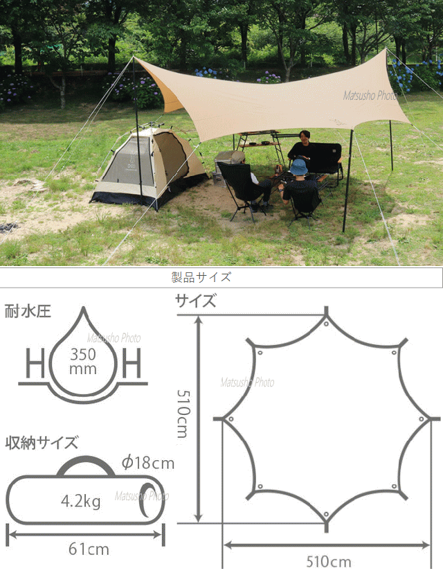 ポリコットン(ポリエステルとコットンの混紡生地)を使用した5.1×5.1mの超大型タープテントです。8ヶ所の全ての角にポールとグロメットを付ける事ができるため状況に応じて自由自在に張る事ができます。流線型で風を受け流しロープを張る場所もヘキサタープより多いオクタゴン型のため大型タープテントながら耐風性に優れています。■カラー:タン■サイズ約W510×D510cm■収納サイズ約W61×D18×H18cm■重量約4.2kg(付属品含む)■最低耐水圧350mm■材質:ポリコットン(ポリエステル65%、綿35%)■付属品:ロープ、キャリーバッグ※本製品に使用されているポリコットン生地は防水コーティングされたポリエステル生地等とは異なり水分を吸収した際に綿素材が膨張し雨漏りを防ぐ構造です。濡れたまま保管をすると科学繊維に比べてカビが生じやすいためご注意下さい。ポール、ペグは付属しませんのでご注意下さい。