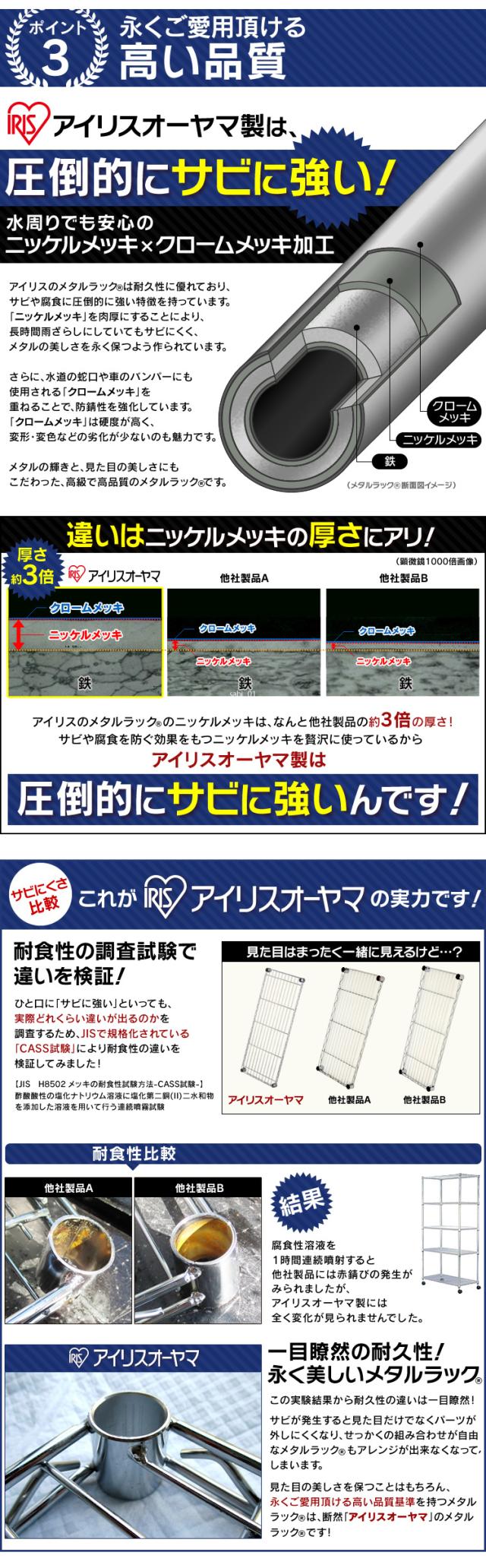 リビング・キッチンなどいろいろな場所で使用できるインテリア製の高いクロームメッキ仕上げのラックです。棚板の高さは自由に変えられます。また、別売部品を使えば、自分だけのオリジナルラック作れます。組み立てはネジやクギを使わずに簡単に組み立てられます。