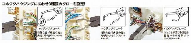 ●束ねられた配線を避け、奥まった個所にあるコネクタハウジングに届きやすい長めのクローを採用しています。