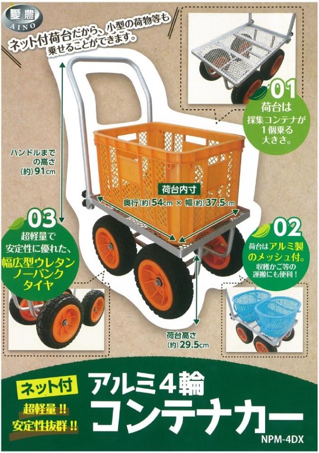 ネット付 アルミ4輪コンテナカー ノーパンクタイヤ付 収穫台車 台車 軽量 運搬車 農機具 農業