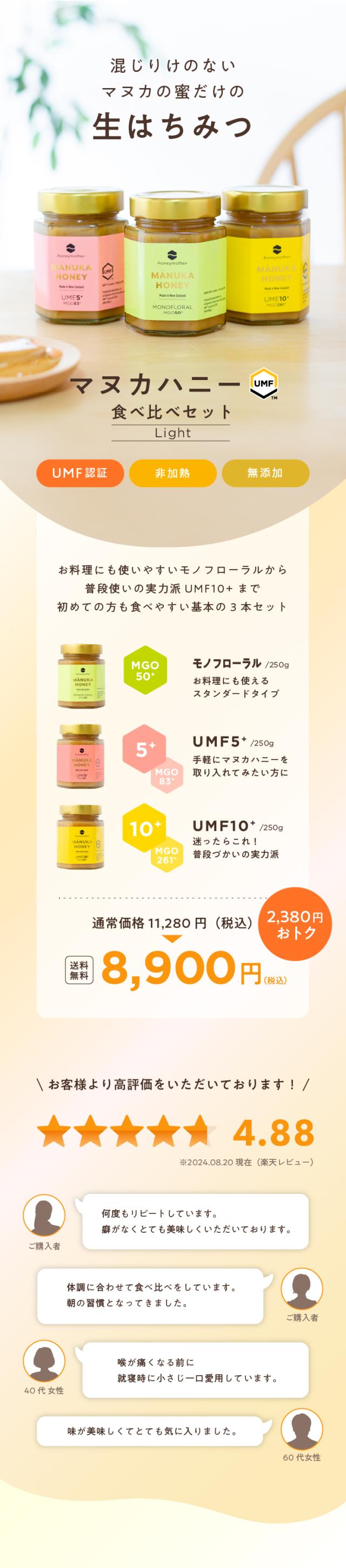 【ライトランク】 マヌカハニー 食べ比べ 3本 セット モノフローラル / UMF 5+ / UMF 10+ 各250g はちみつ ハチミツ 蜂蜜 非加熱