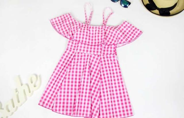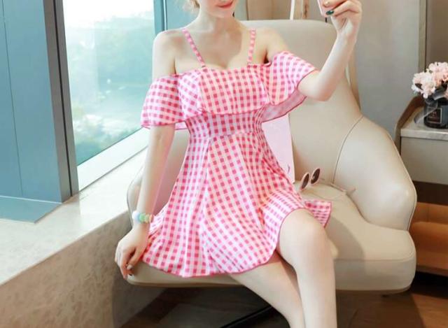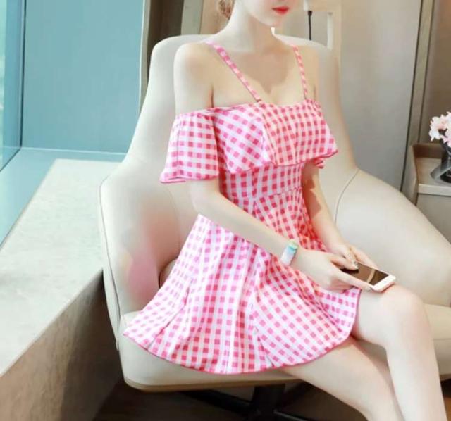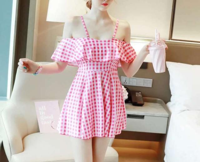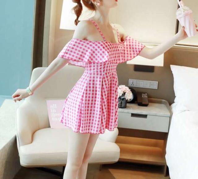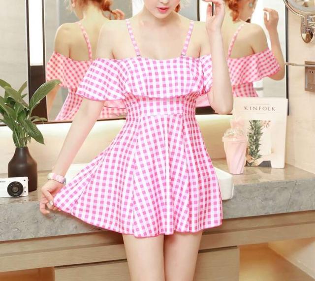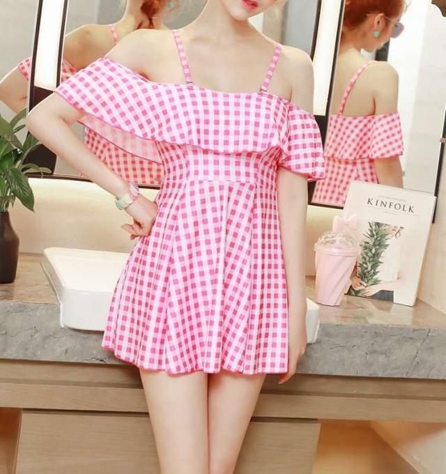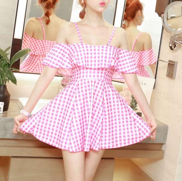 オフショル ギンガムチェック ワンピース水着 ピンク