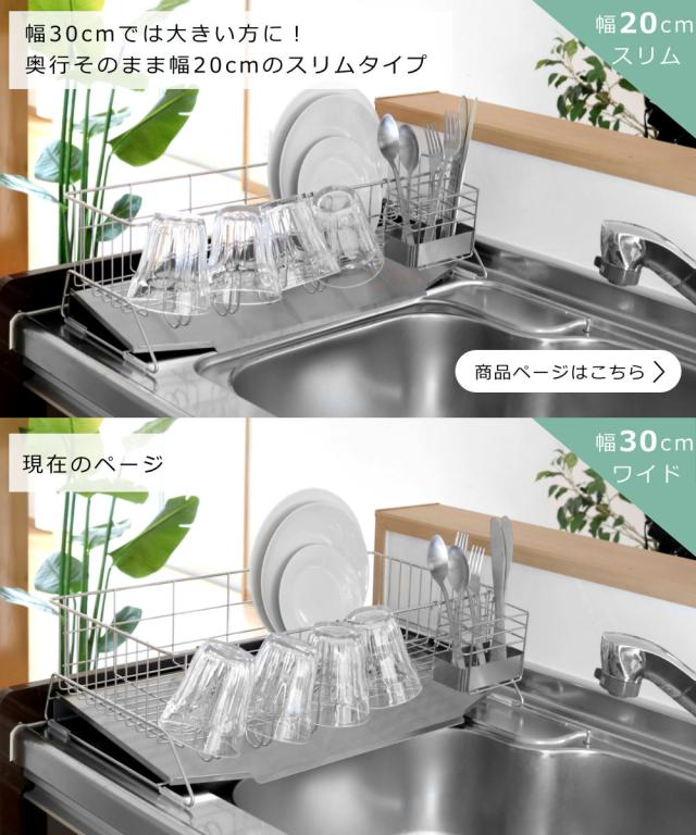 今まで水切りラックを置けなかったシンクサイドの細長いスペースにも置ける、幅約30cmのスリムな水切りラックです。