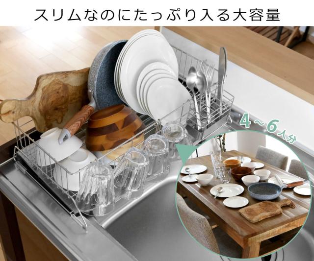 シンクサイドにもぴったり置けるスリムで大容量の水切りラック