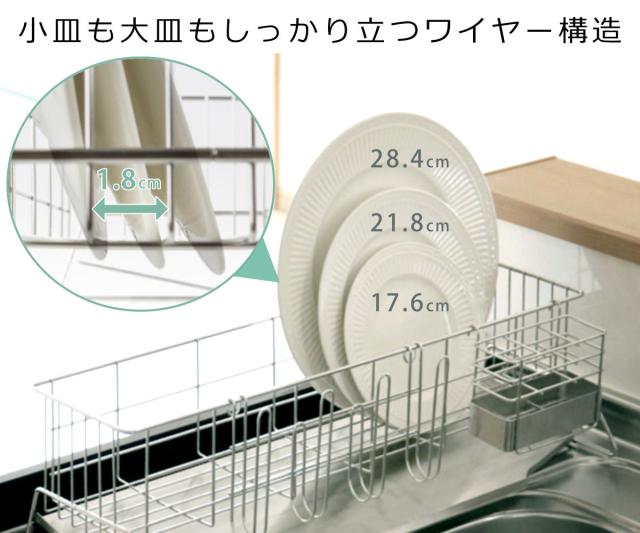 1.8cm間隔のワイヤーが、小さなお皿から大きなお皿までしっかりキャッチします。自立して立てて置くことで、洗い物が多いときでもキレイに並べて乾かせます。