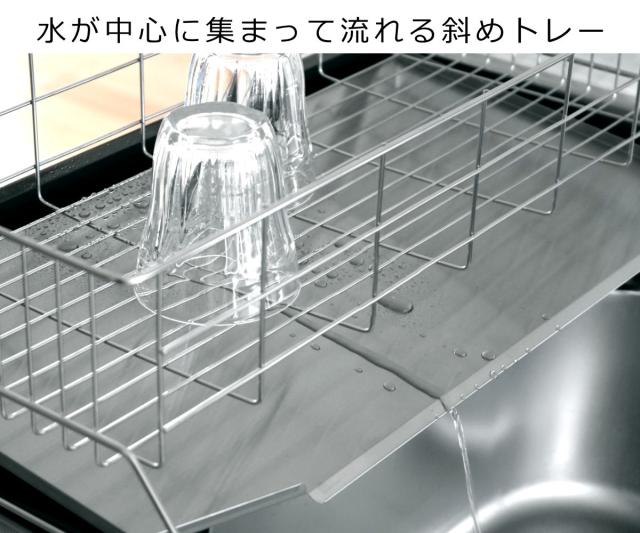 食器から落ちた水は、傾斜のついたトレーから中心に集まり、自然にシンクへ流れる構造となっており、トレー内に水が溜まらず衛生的です。付属品はすべて取り外して洗うことができます。サビや水アカに強いオールステンレス製なので長くお使いいただけます。