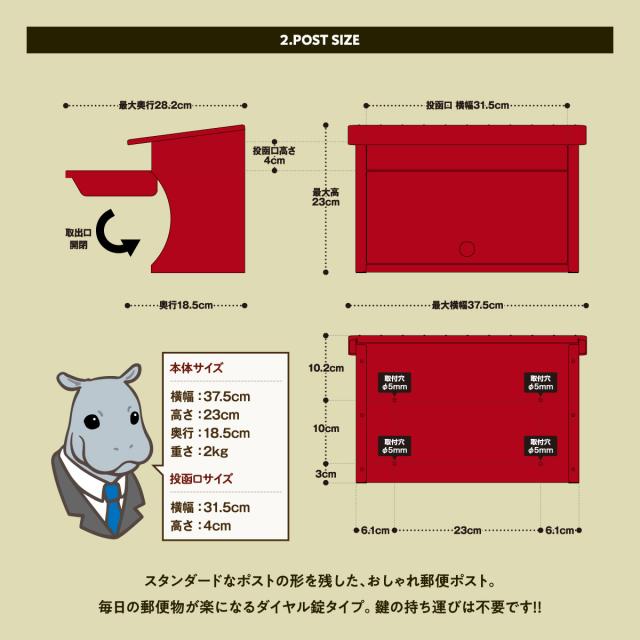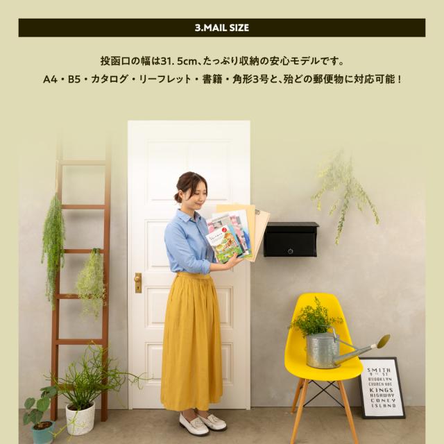 従来からのポストの悩み、鍵の管理が不要。ダイヤル式のロックなので、「鍵を無くして郵便を取り出せない」「いちいち鍵を取り出すのが面倒」といった心配がありません。(※あらかじめ暗証番号が設定されています。)万全のセキュリティーで個人情報が洩れる心配もありません。プライバシーを守りつつ、手間を軽減する郵便ポストです。