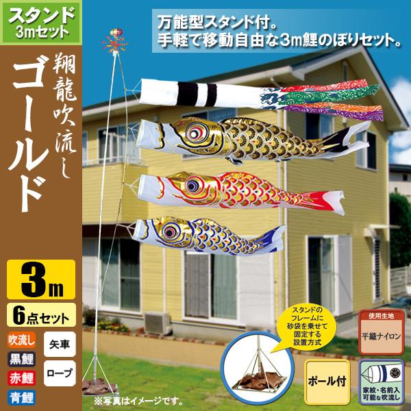 鯉のぼり こいのぼり 翔龍付ゴールド鯉スタンドセット 3m 6点 ポール5.3m おもり(砂袋) 翔龍吹流し