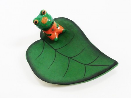 葉っぱの上のちょこんとしたカエルが可愛いトレイです。