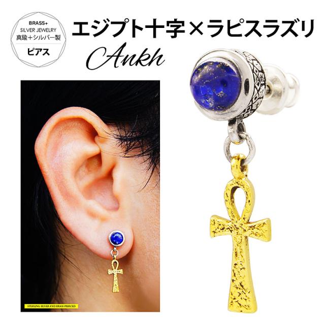エジプトの十字架、アンクをモチーフにしたピアス。天空の破片とも云われエジプト王の装飾などにも使われていたラピスラズリと組み合わせたピアスです。デザインになっている十字架は、古代のエジプト文字ヒエログリフで「アンク」と表す文字を象ったエジプト十字とよばれる十字架。アンクは古来より長寿や厄除けのお守りとして身に着けられていました。