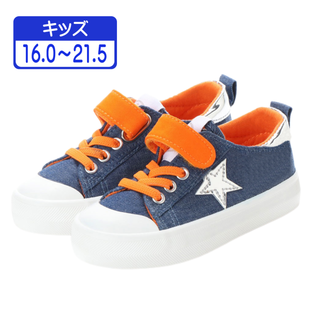 デニム調デザインが かわいらしさとオシャレ感をアップ、子供用 カジュアル スニーカー。