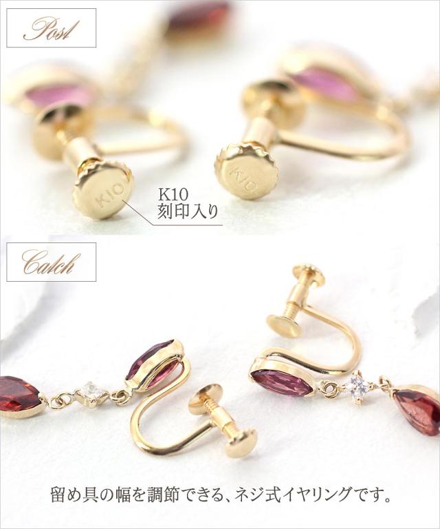 | 地金・素材 | ・ロードライトガーネット マーキスカット ・ガーネット ペアーシェイプカット ・キュービックジルコニア スクエアカット ・地金:K10YG(10金イエローゴールド) ・イヤリング留め具:ネジ式 |