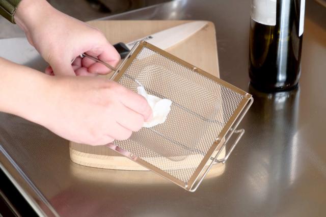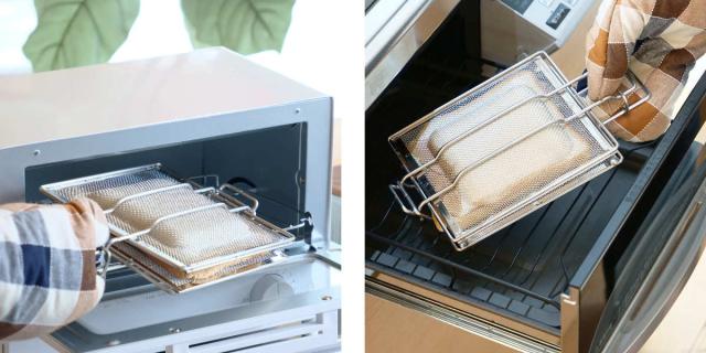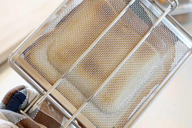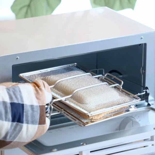 トースターでは、トーストを焼く感覚で簡単に作れます。魚焼きグリルでは短時間で高温になるため、水分が抜ける前にパンの表面が焼けて外はサクッ、中はふわっという食感に仕上がります。メッシュになっているので、焼き具合が一目で分かり、焦がす心配がありません。