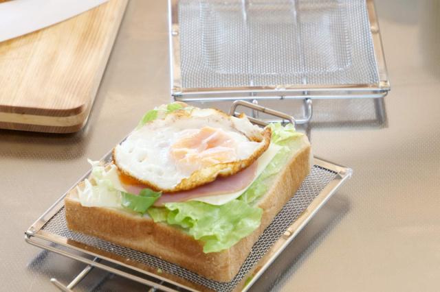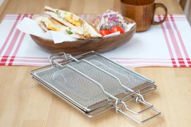 一般的なホットサンドメーカーは鉄やアルミでできたものや家電などがありますが、重たくて場所も取るので、使うのに少し躊躇してしまいます。こちらはステンレス製のアミでできており、小さくて軽いので扱いやすく、収納場所にも困りません。