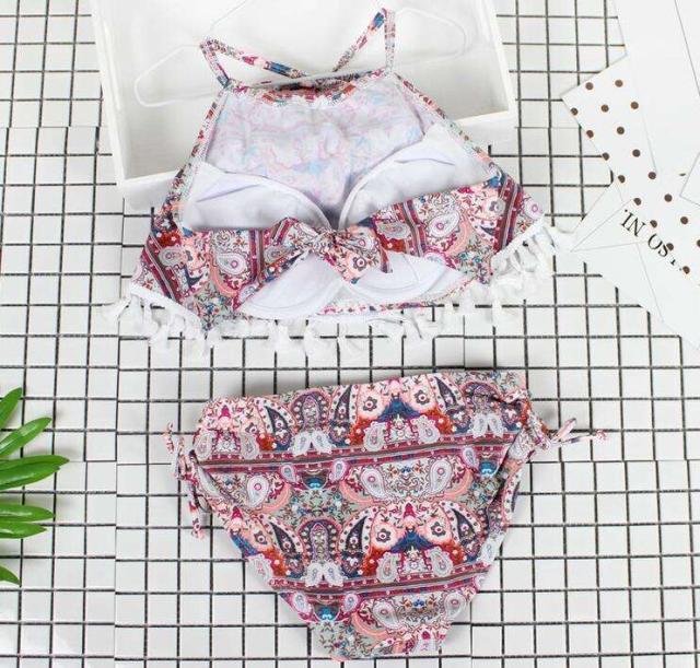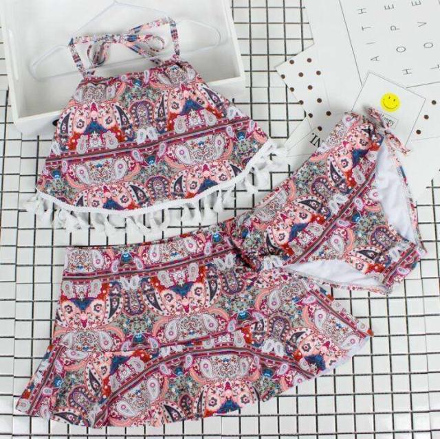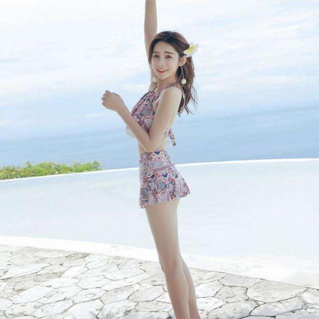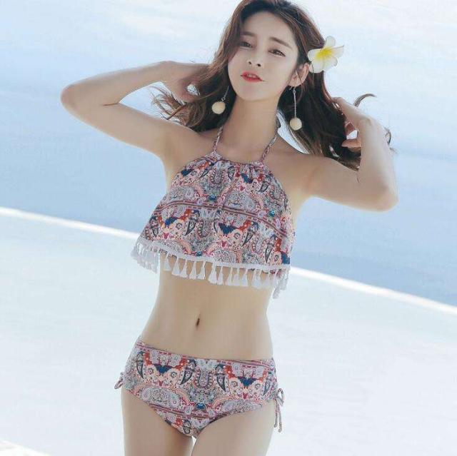 体型カバー 水着 ビキニ タンキニ 3点セット 大きいサイズ レディース 2019年新作 ビーチウェア 40代 30代 20代 ホルターネック パッド付き フレアスカート フリンジ セットアップ ペイズリー シフォン 総柄 カバーアップ 小胸 着やせ 韓国 ママ オシャレ XL 海