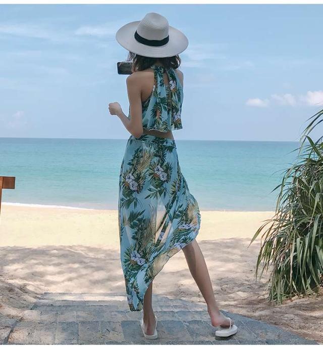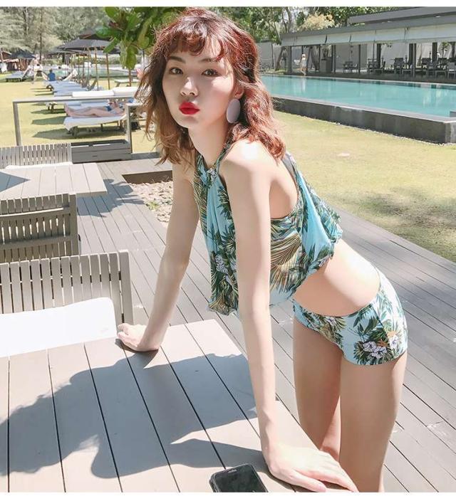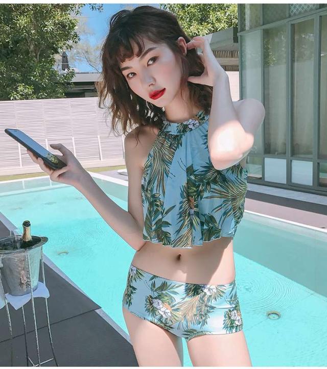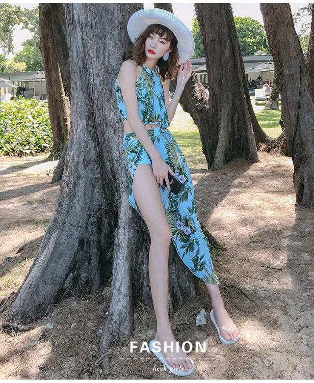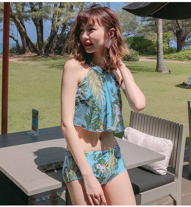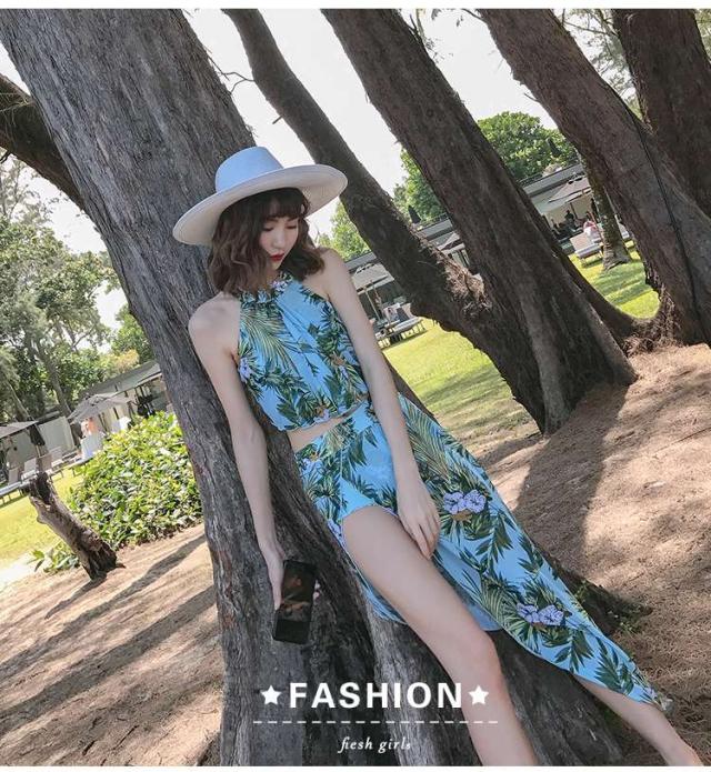 体型カバー 水着 ビキニ タンキニ 3点セット 大きいサイズ レディース 2019年新作 ビーチウェア 40代 30代 パレオ フレア フリル ホルターネック セットアップ ボタニカル柄 トロピカル シフォン きれいめ カバーアップ 着やせ 韓国 ママ水着 オシャレ XL 海 プール