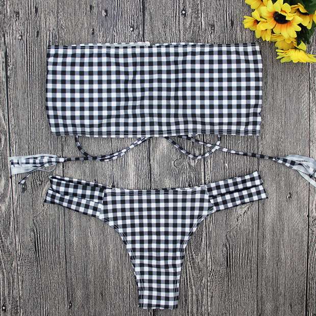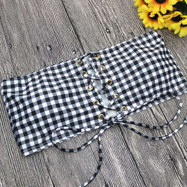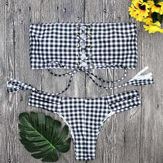 ビキニセット 2点セット ツーピース セパレート ギンガムチェック バンドゥ レースアップ モノカラー 大人可愛い セクシー おフェロ