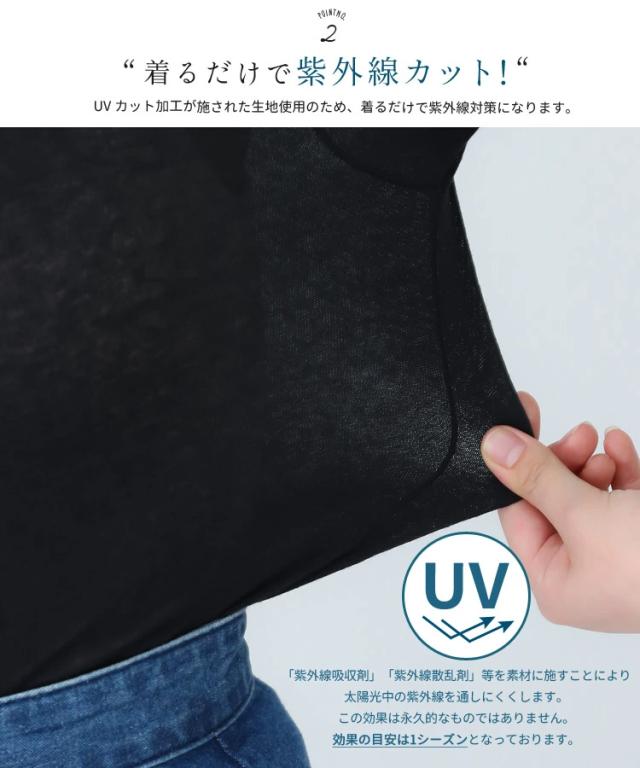 紫外線の多い季節に快適な、UVカットの薄手カットソーです。生地に紫外線の透過率を軽減させる加工を施し、強い日差しも安心。