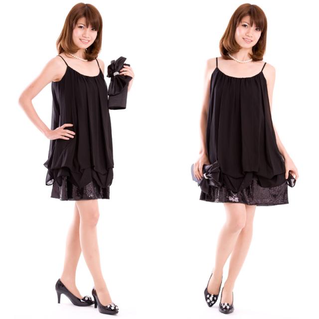 シンプルなキャミどれすと思いきや、裾のスパンコールでドレス感がアップ。ショールやボレロなどの羽織ものとの相性も抜群です。