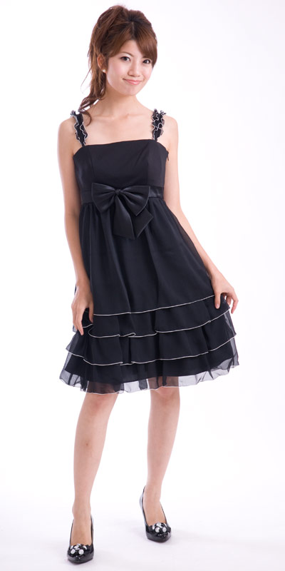 大手百貨店にドレスを提供している国内アパレルメーカーの製品です。小ロットの生産は国内、大ロット生産は中国と使い分けていて、中国製でもクオリティーはまったく心配ありません。大手百貨店で約2万5千円で販売されている商品を、サンプル現品限りで格安でバーゲンセールします。再販の予定はありませんので、お気に入りのデザインがありましたら、お早めにご購入ください。シンプルなブラックサテンの肩ひもも付属していますので、シンプルなブラックドレスとしてもご利用いただけます。胸元のサテンリボンも取り外し可能です。