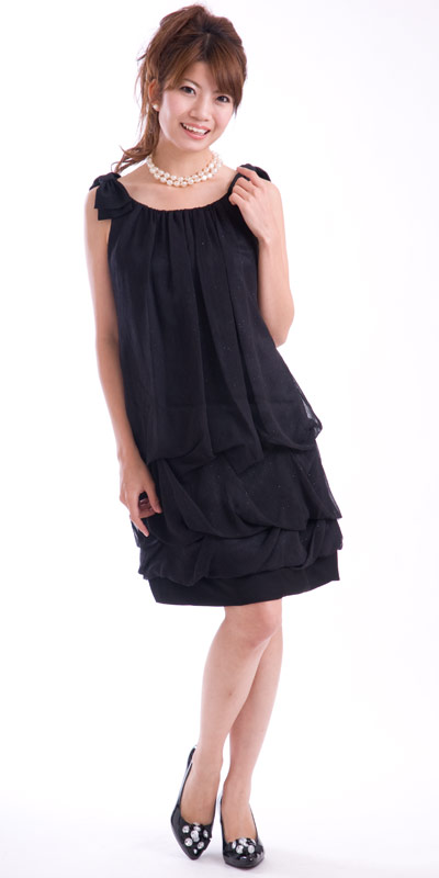 大手百貨店にドレスを提供している国内アパレルメーカーの製品です。小ロットの生産は国内、大ロット生産は中国と使い分けていて、中国製でもクオリティーはまったく心配ありません。裾にホックが付いていて、ホックを留めると裾が上がり、バルーンとして着用できます。モデル写真はホックを留めていない状態です。