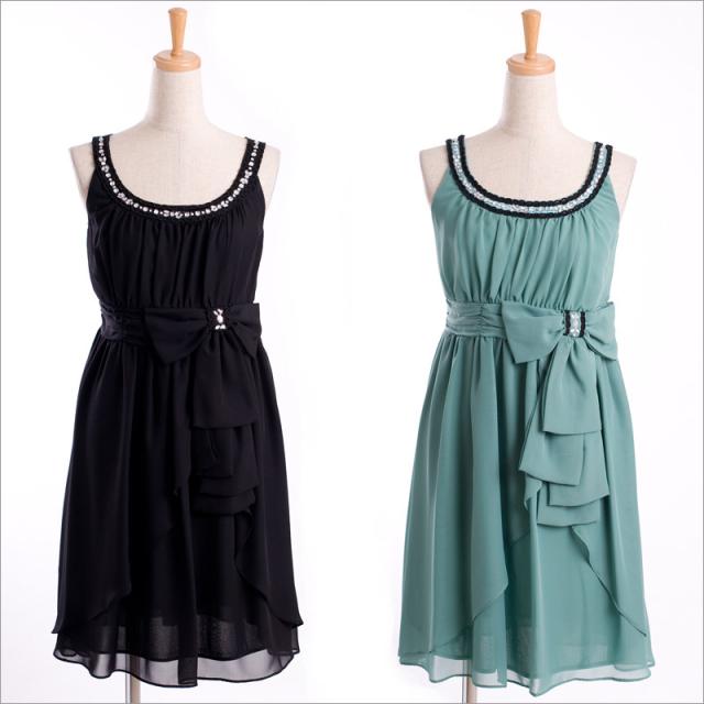 ウエストリボンシフォンノースリーブパーティードレス