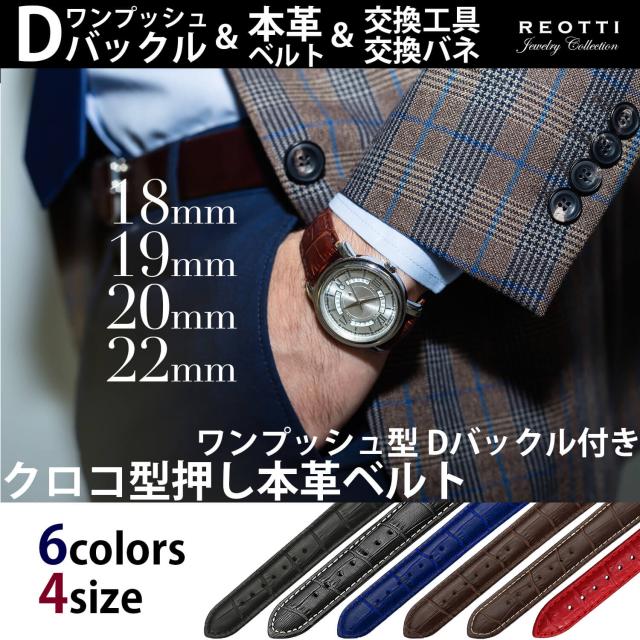 【送料無料】REOTTI 本革 腕時計 Dバックル ワンプッシュ式 ベルト 交換工具・バネ付き 18mm 19mm 20mm 22mm
