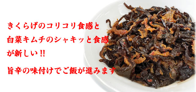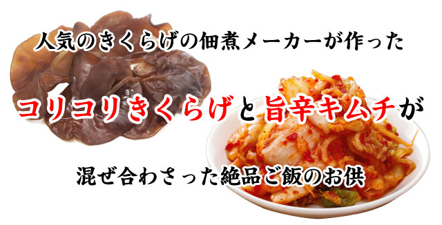白菜キムチ(白菜、大根、その他)(韓国製造)、醤油、砂糖、乾燥きくらげ、キムチの素(唐辛子、大根、砂糖、魚醤、りんご加工品、おろしニンニク、オキアミ塩辛、その他)、発酵調味料、醸造酢、風味調味料/ソルビット、調味料(アミノ酸等)、トレハロース、ph調整剤、酸味料、V.B1、保存料(ソルビン酸K)、増粘剤(キサンタン)、甘味料(ステビア)、香辛料抽出物、パプリカ色素、香料、(一部にえび、小麦、大豆、ごま、りんご、魚醤を含む)