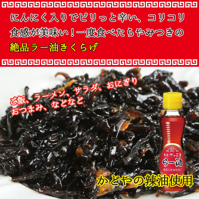 「ラー油きくらげ」「子持ちきくらげ」「梅きくらげ」「ごま油きくらげ」「キムチきくらげ」