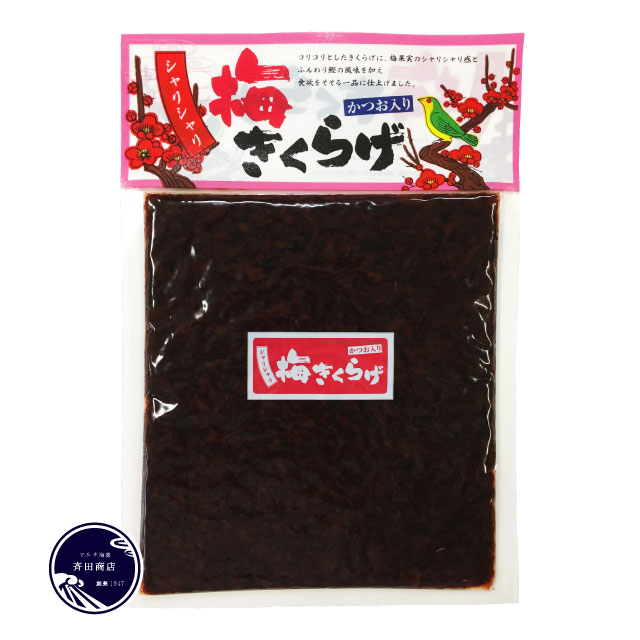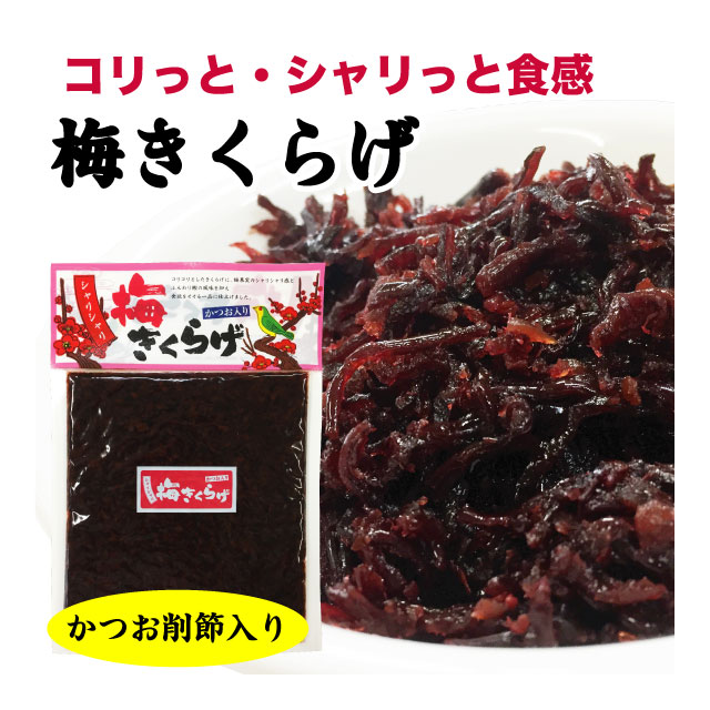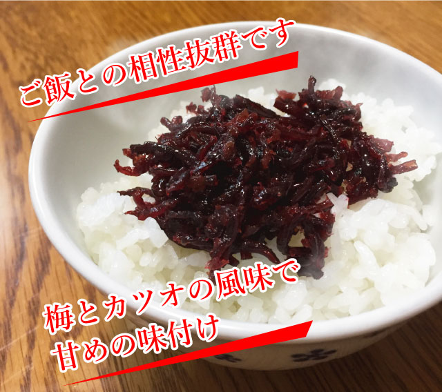 醤油(大豆、小麦を含む)、砂糖、調味梅漬(梅、食塩、還元水飴、その他)、きくらげ、米発酵調味料、かつお節、醸造酢、かつお風味調味料、ソルビット、調味料(アミノ酸等)、酸味料、酒精、甘味料(ステビア)、保存料(ソルビン酸K)、着色料(野菜色素、赤106、赤3)