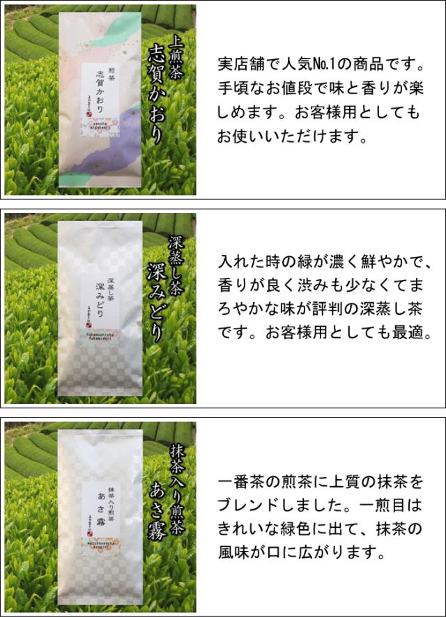 商品説明 おすすめの煎茶・深蒸し茶・抹茶入り煎茶をセットしました。