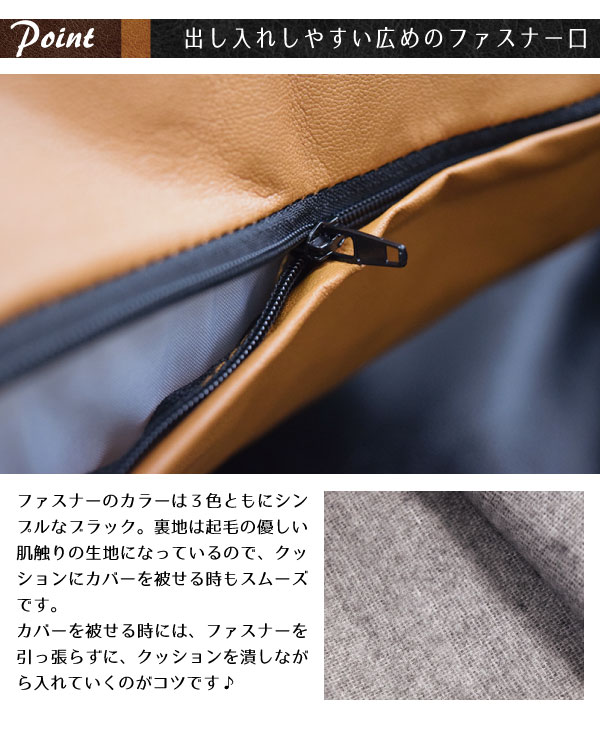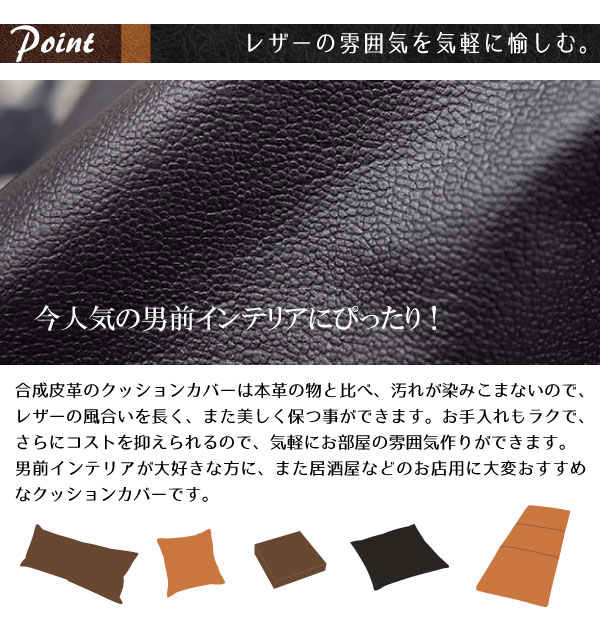 ◆無骨で男前な雰囲気のPUレザーのクッションカバー。もちろん女の子のお部屋でも。ちょっとスパイスを効かせるのに効果的です。