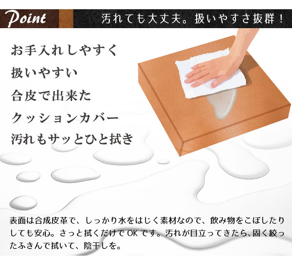 ◆PUレザーのクッションカバーは、水をはじく素材なので、お手入れしやすく扱い素材です。汚れても大丈夫。水分を吸い込みにくいので、サッとひと拭き扱いやすさ抜群です。