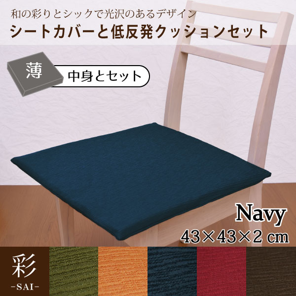 カバー&中身セット クッション 低反発ウレタン 在宅勤務 シートクッション ネイビー 彩 紬風生地 2cm 厚 カバーセット 43×43×2cm 薄タイプ