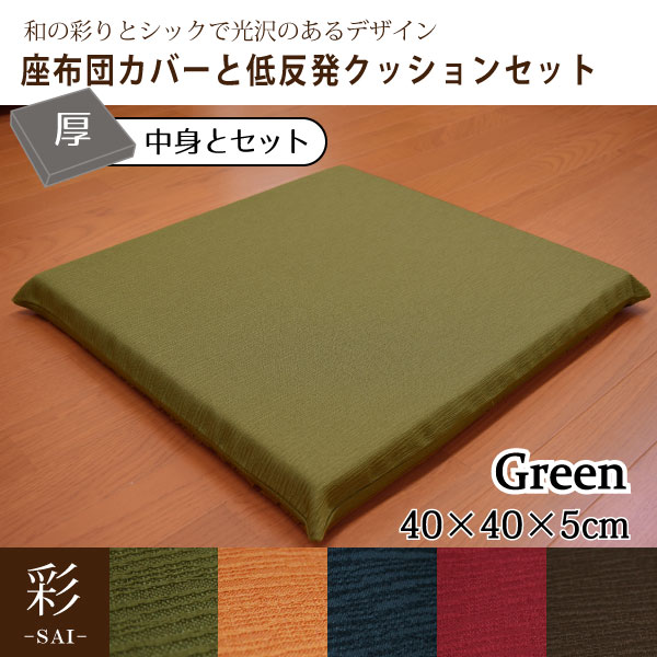 座布団 カバー&中身セット おしゃれ 在宅勤務 和風 低反発 彩 紬風生地 5cm ウレタン グリーン 50×54×5cm 洗濯可