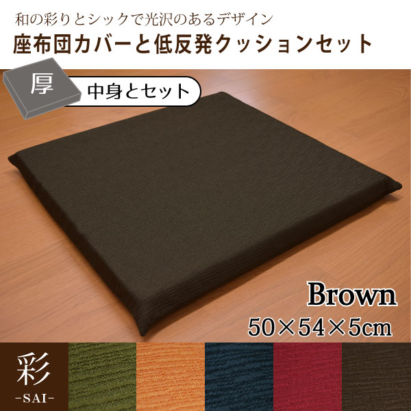 座布団 カバー&中身セット おしゃれ 在宅勤務 和風 低反発 彩 紬風生地 5cm ウレタン ブラウン 50×54×5cm 洗濯可