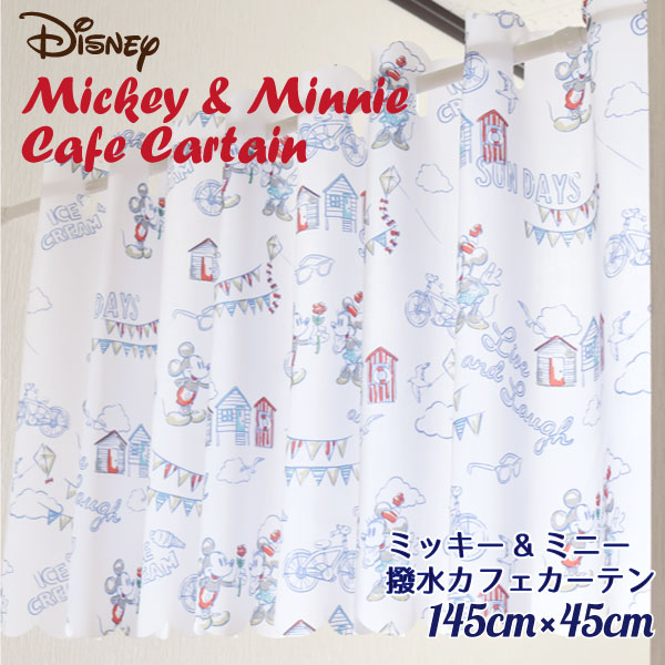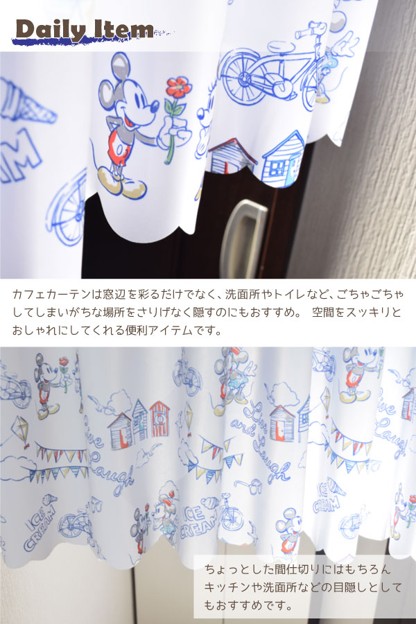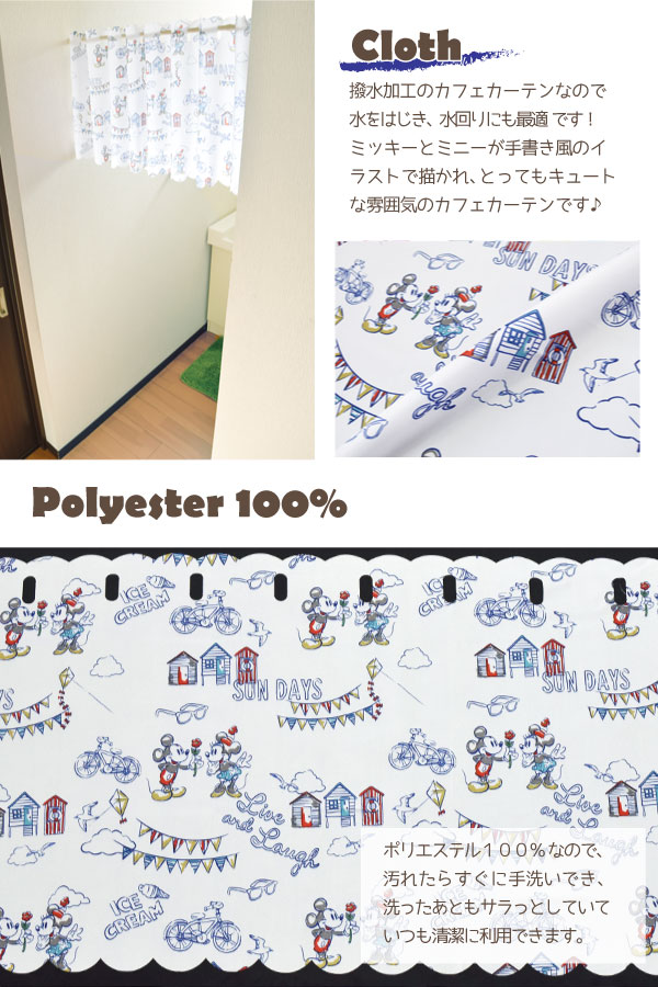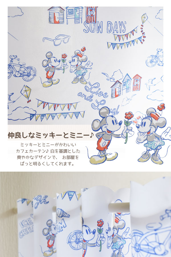 ・ミッキーとミニーがかわいいカフェカーテン♪・白を基調とした爽やかなデザインで、お部屋をぱっと明るくしてくれます。・清潔感あふれる色合いで、男女年齢問わずお使いいただけます。・撥水仕様ですので、出窓やカウンターだけでなく、キッチン等の水回りにも最適なんです!・透けにくいので、お風呂場の窓の目隠しとしてもGOOD!・撥水仕様に加えて手洗いも出来ますので、清潔でキレイにお使い頂けます。