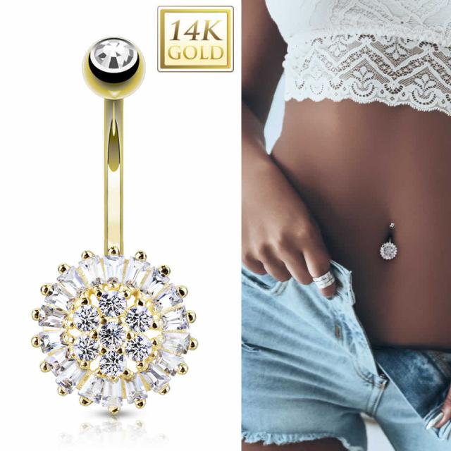 14金素材の14ゲージのへそピアスに大きくクリスタルのキュービックジルコニアで向日葵(ヒマワリ)をデザインしたボディピアス。太陽に向かって咲く大きな花のジルコニアが高級感もたっぷり。K14イエローゴールドを使った本物のへそピアスはプレゼントにも最適。レディース人気のフラワーモチーフボディピアス。ファーストピアスやセカンドピアスにも使えるヘソピアスです。高級ボディーピアスは誕生日やクリスマス。記念日のプレゼントに。シャフトに14Kの刻印があります。