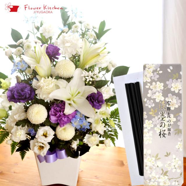 明日着 お供え花 フラワーギフト お供え フラワーギフト アレンジ Lサイズ + 宇野千代 「淡墨の桜」 お線香 お花とお線香 セット 法事 命日 喪中はがきが届いたら メッセージカード FKAA