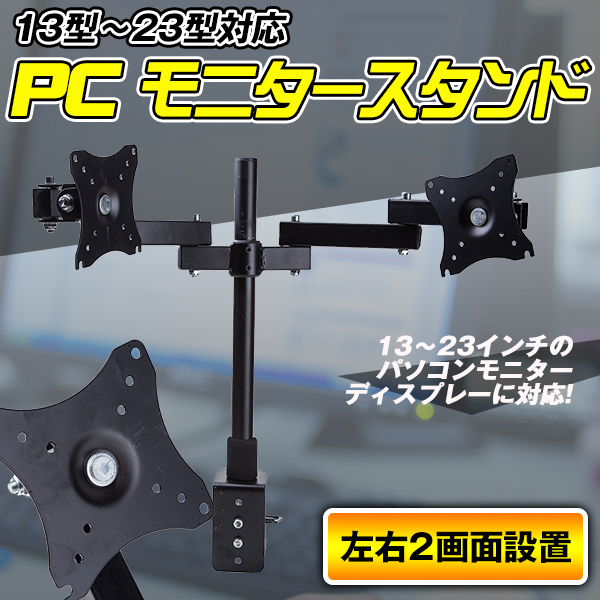 モニタースタンド 13 型 〜 23 型 対応 ダブル 左右 2画面 設置 デスク 収納 カスタム ブラック 黒 パソコン スチール 天板クランプ式 フレキシブル PC